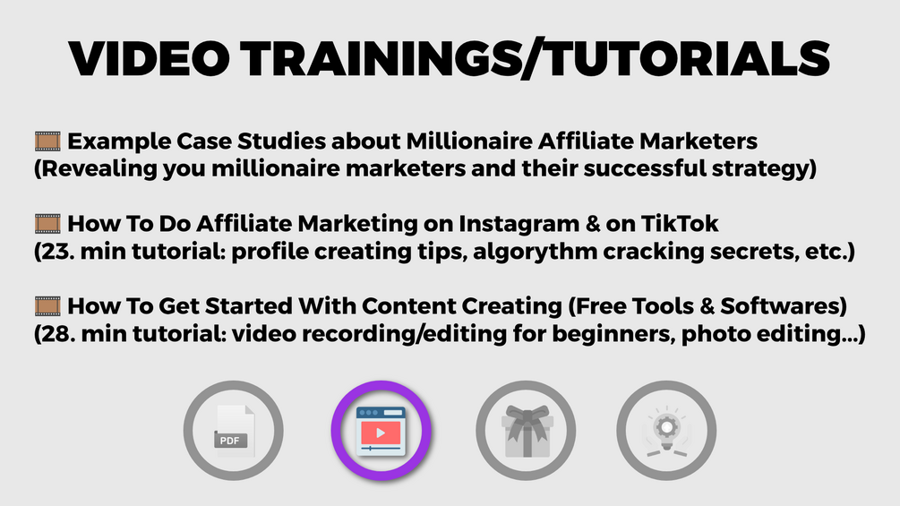 If you buy this package, you will have access to a number of amazingly useful things: pdf guides for different topics, training videos with more knowledge, and other bonuses.